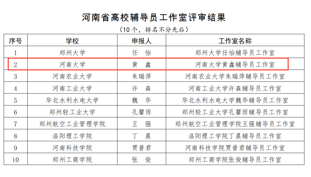 近日,河南省委教育工委、河南省教育厅公布《关于河南省高校辅导员工作室评审结果的公示》,我校党委学生工作部组织申报的“亚搏平台黄鑫辅导员工作室”榜上有名。此次评选活动自今年7月启动,经各高校申报、资格审查、专家评审、综合评议等环节,评选出10个河南省高校辅导员工作室。