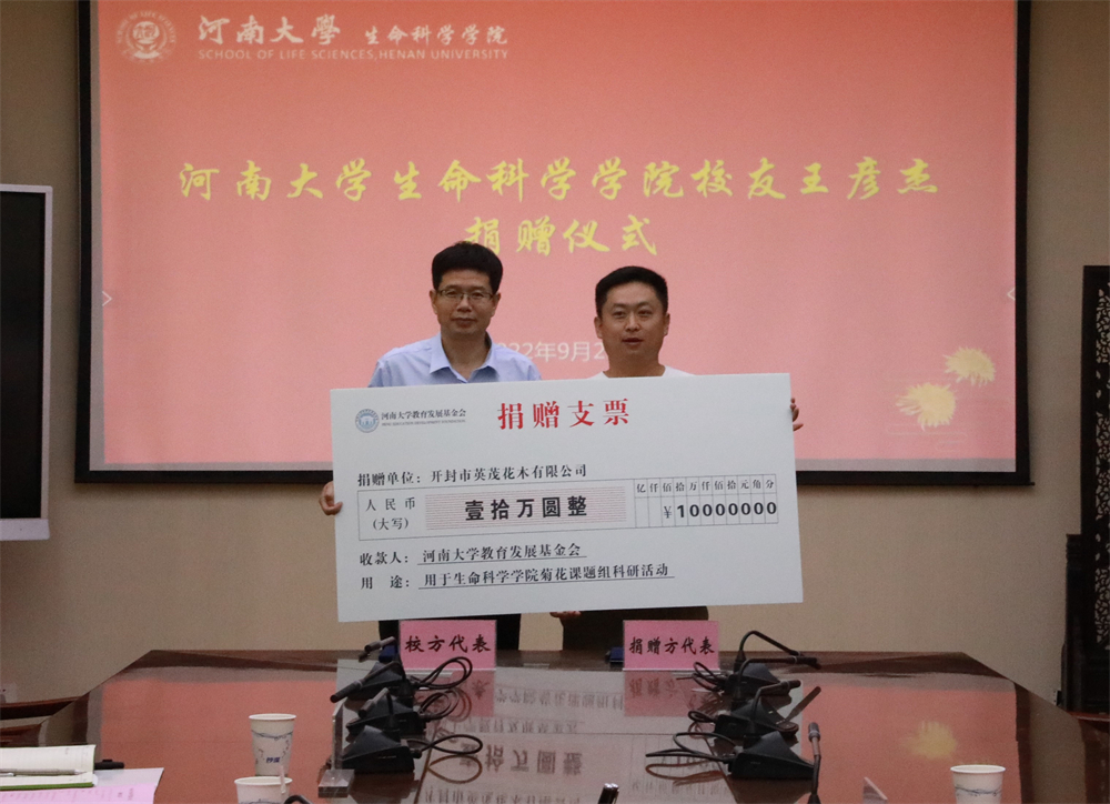 9月22日上午,生命科学学院在学院B201会议室举行校友王彦杰捐赠仪式。我校2010级校友、开封市英茂花木有限公司总经理王彦杰,亚搏平台教育发展基金会副秘书长唐胜,生命科学学院党委书记吴建伟、执行院长王刚、党委副书记程亚敏、菊花课题组负责人王子成等参加了捐赠仪式。仪式由吴建伟主持。