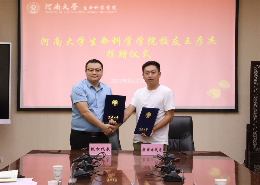 唐胜代表学校教育发展基金会与王彦杰签订捐赠协议,并感谢王彦杰等优秀校友对学校的关心和支持,临近校庆,欢迎各位优秀校友返回母校,并祝愿校友们事业蒸蒸日上,取得更大的成绩,也希望学院能充分挖掘校友资源,助力生物学科再创新辉煌。