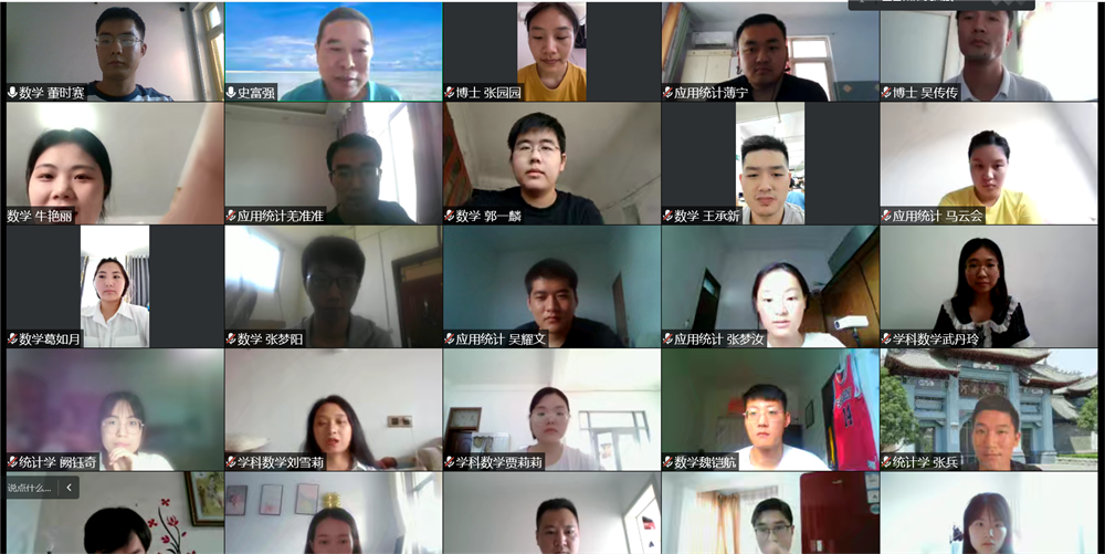 9月6日下午,史富强以“院史院情教育”为主题,首先对当前开封市和我校的疫情防控形势进行了介绍,对同学们疫情期间的健康状况表示关切,并代表学院表达了对全体2022级研究生新生的热烈欢迎。接着讲述了亚搏平台辉煌的历史、艰难曲折的发展道路以及逐步复兴的历程。然后以学院的发展史为切入点,详细介绍了黄际遇、陈作钧、樊映川、黄敦慈、杜孟模、刘亚星等先后在学院执教的著名数学家和教育家,他们为学院的发展作出了巨大贡献,令同学们身临其境,感受颇深。最后,史富强勉励同学们要加强体育锻炼,在学习生活中养成独立思考、解决问题的能力,提升自身综合素质,努力成为创新型、应用型、复合型优秀人才。会议结束时,史富强与同学们“云”合影留念。