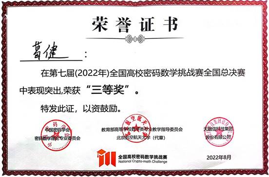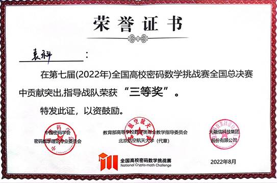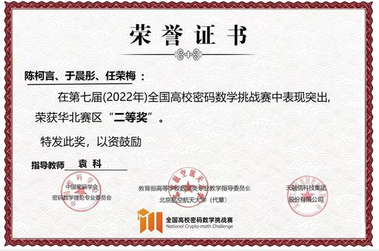 8月19日,第七届全国高校密码数学挑战赛总决赛在华中科技大学完美收官。亚搏平台计算机与信息工程学院共有7支队伍参赛,最终“SpecialRain”战队(队员:周柄材、葛健;指导教师:袁科)和“密码小白冲冲冲”战队(队员:陈柯言、于晨彤和任荣梅;指导教师:袁科)分别荣获全国三等奖和华北赛区二等奖的好成绩,实现了学院在该赛事上零的突破。