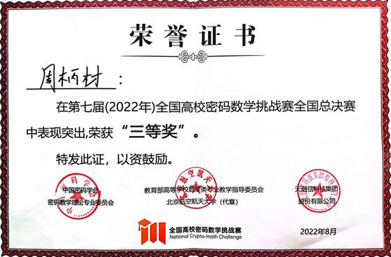 计算机与信息工程学院参赛队伍成员均为2020级信息安全专业的本科生。在袁科老师的指导下,参赛队员开展深入学习和文献阅读,跨越了面对陌生的赛题背景知识和没有接触过的数学理论及工具的障碍。经历层层选拔,学院两支参赛队伍分获华北赛区一等奖、二等奖。在之后十余天备战决赛的时间里,参赛队员周柄材和葛健能够积极思考、刻苦钻研、挑战自我,在指导老师袁科的指导下在总决赛中生动、清晰的展示了对赛题的解决方案,顺利完成了总决赛答辩,并获得了全国三等奖的优异成绩。