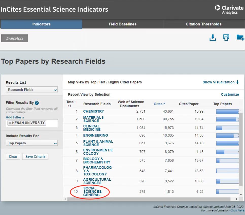 根据科睿唯安9月8日发布的最新ESI(Essential Science Indicators,基本科学指标数据库)统计数据,我校社会科学总论(Social Sciences, General)进入全球排名前1%行列。截止目前,我校已有化学、材料科学、临床医学、工程学、植物学与动物学、药理学与毒理学、环境科学与生态学、生物学与生物化学、农业科学、社会科学总论等10个学科进入ESI全球排名前1%,学校ESI国内排名第104位,全球排名第1170位,较上期统计排名提升33位。